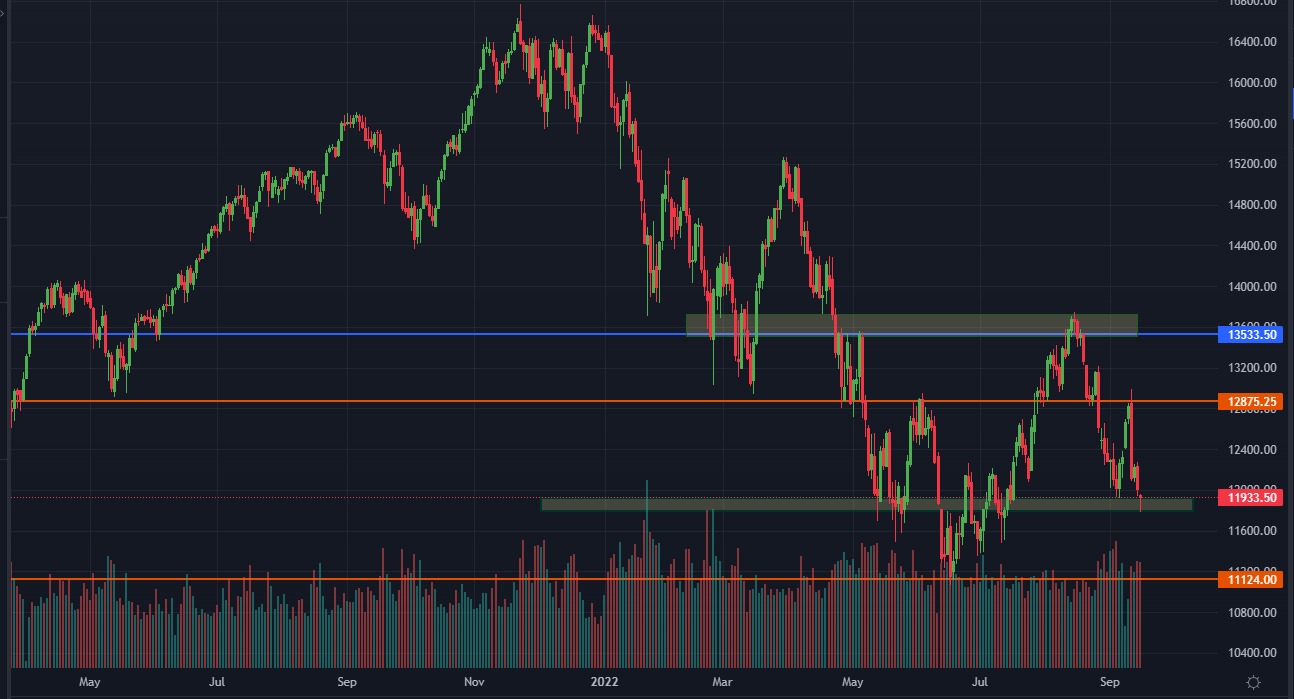 Nasdaq is also sitting at support, and if a breakdown happens, I would expect it to reach range lows quicker than the SPY. If a bounce occurs, I can see it reaching 12.8k before returning to range lows.