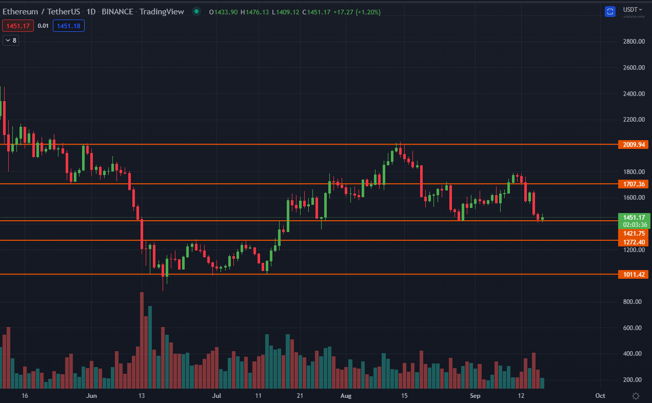 I expect us to break 1450 and 1270 and then chop for a bit before returning back to range lows at 1k, as I see BTC going lower.